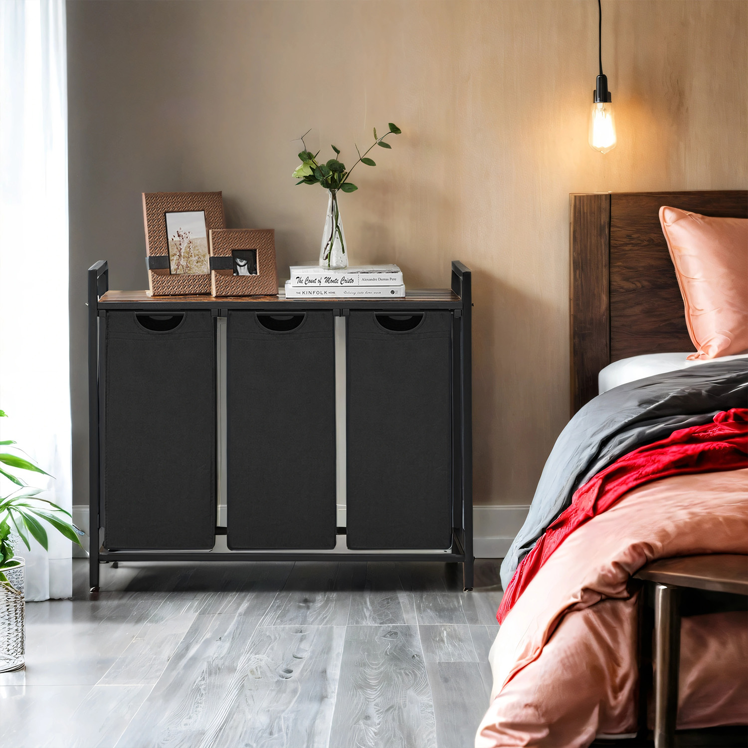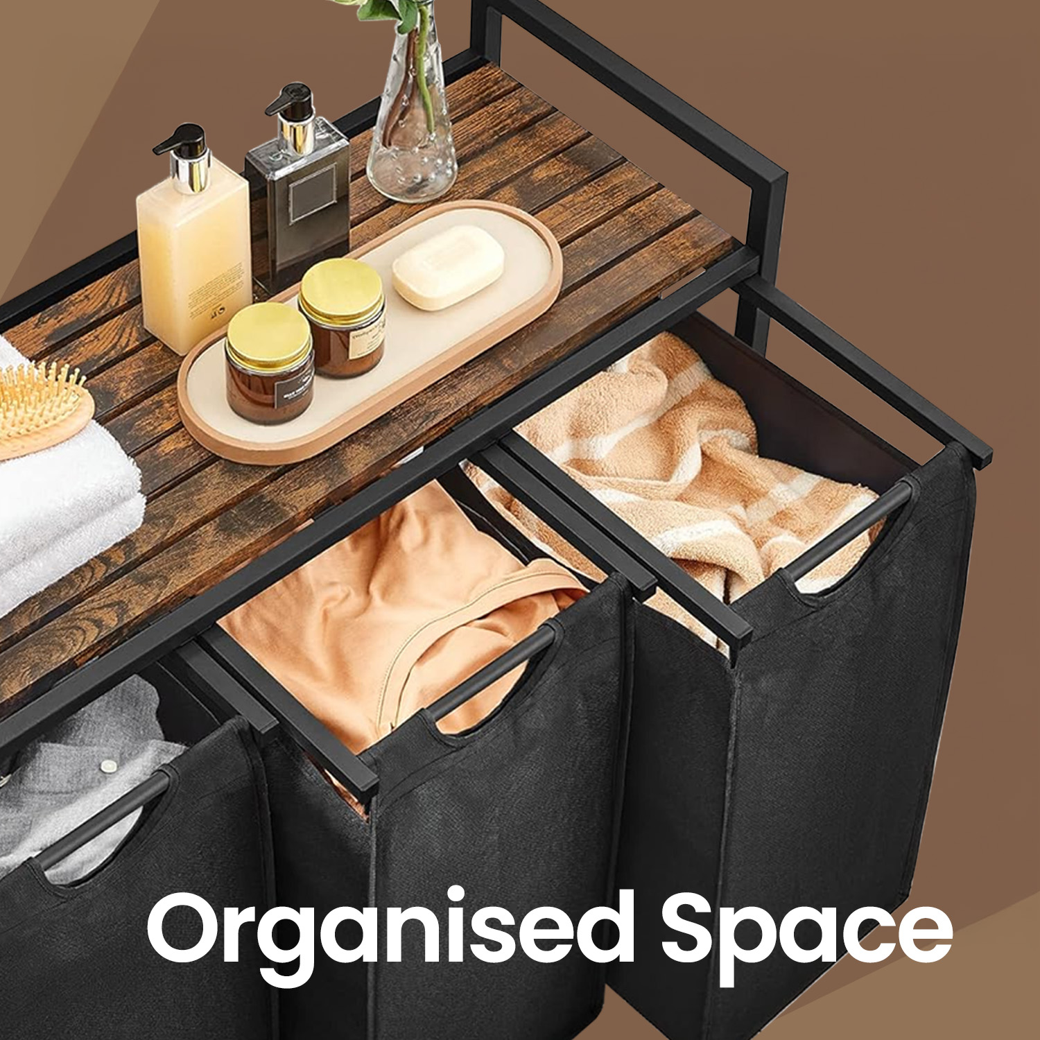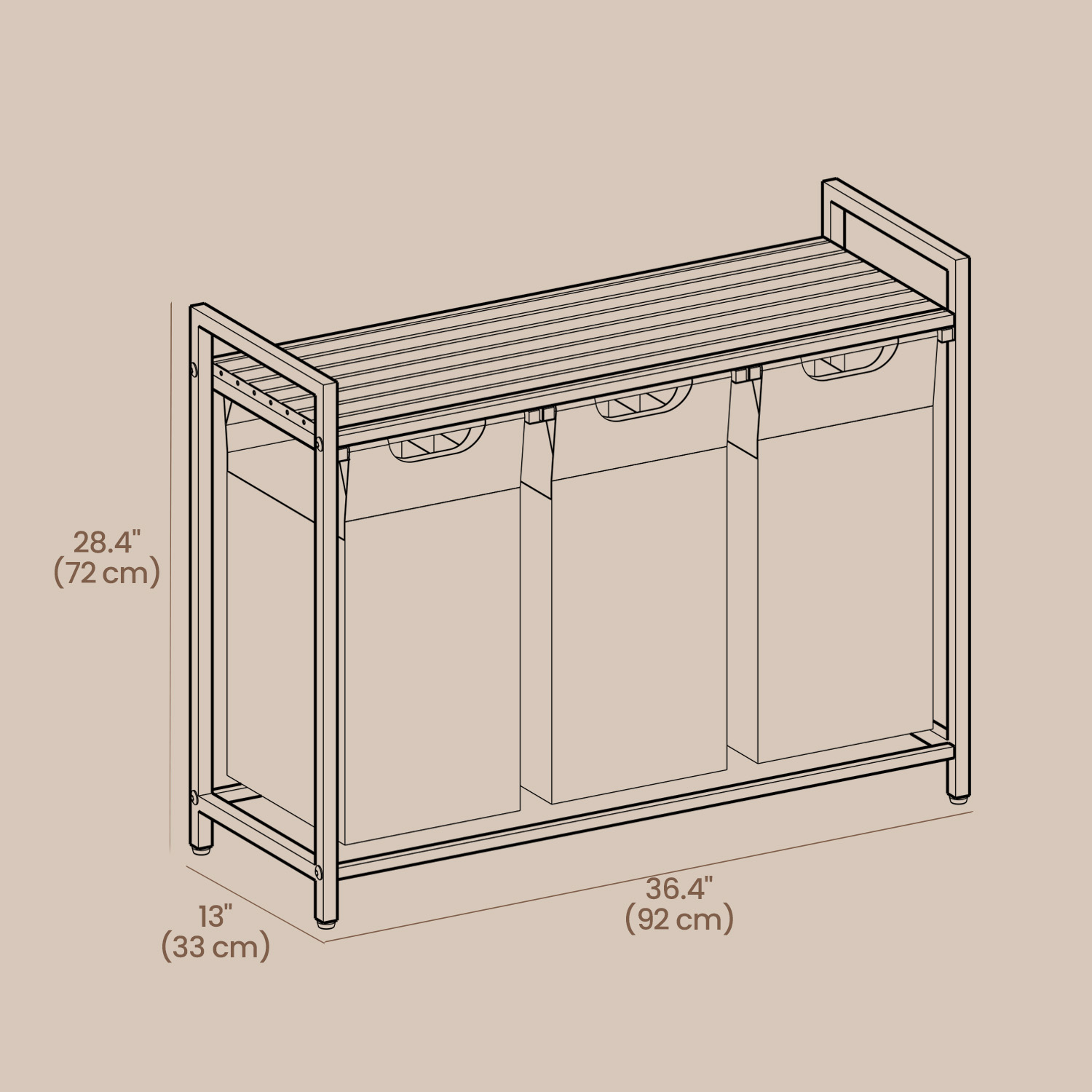 3 Bags, 1 Shelf—so much storage space! Sort your laundry with the three fabric bags(38L per bag), and set the detergents and softeners on the shelf. All your storage needs for a breezy laundry day are welcomed by this laundry hamper.