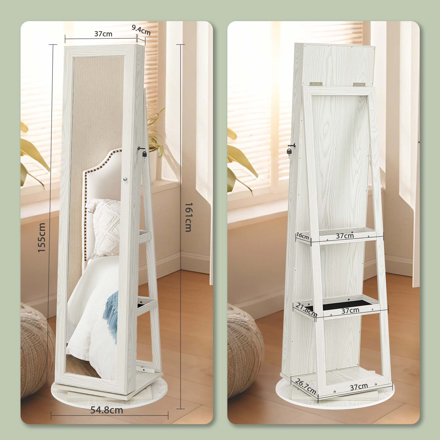 This multifunctional jewelry cabinet combines a dressing mirror, storage shelves, and ample organization in one elegant design. Featuring a 360° swivel mirror, it lets you view your jewelry from every angle without closing the door. The spacious back shelves provide extra storage for bags, makeup, and clothing, while the low cabinet edge maximizes space. Crafted from high-density board with durable hardware, it includes a lock with two keys and a magnetic door for secure closure. Inside, multiple compartments, slots, and hooks accommodate a wide range of jewelry, all protected by a soft velvet lining to prevent scratches and dust.