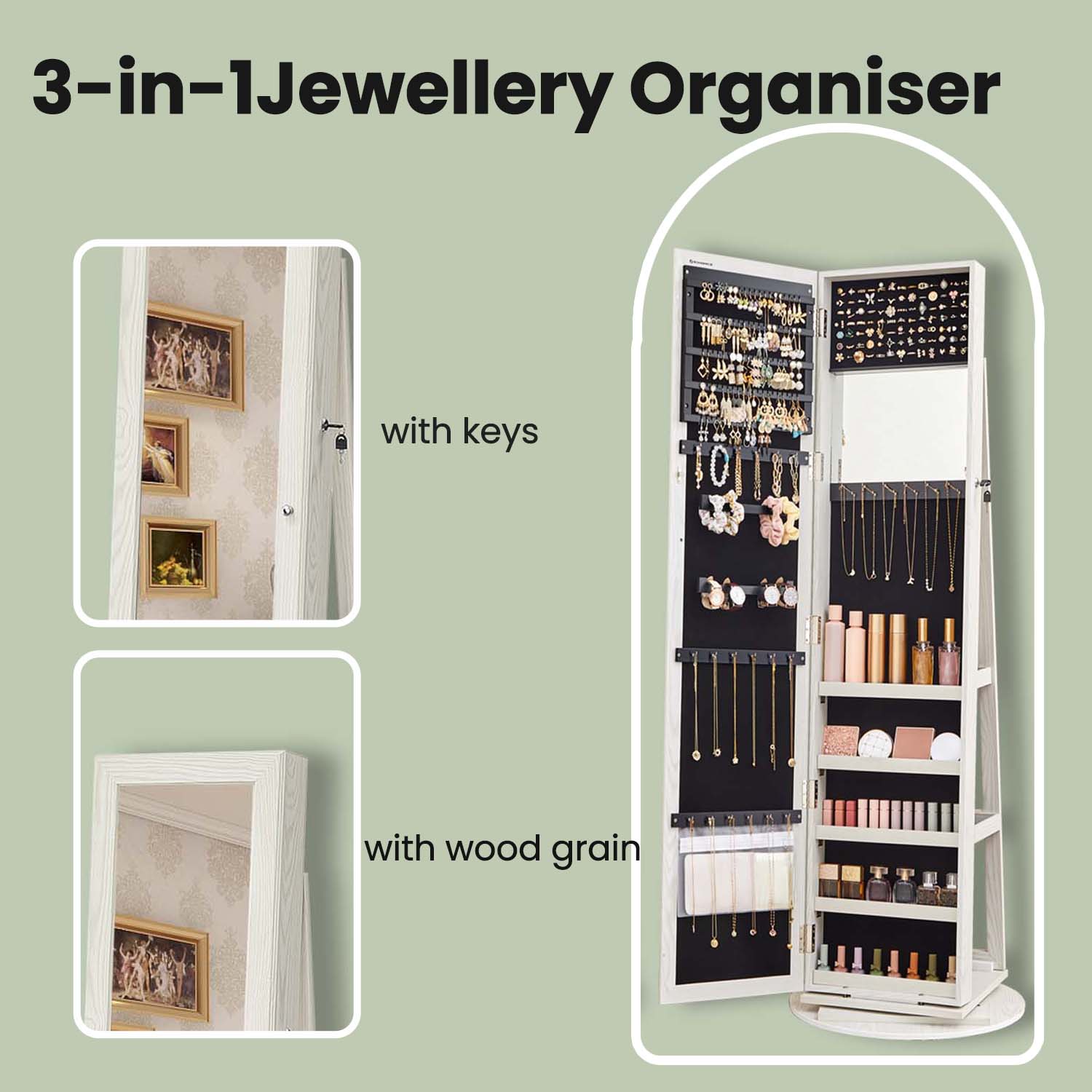 Novel Design: Jewelry cabinet, dressing mirror, and storage shelf into one; this item is convenient to use. With a 360° swivel function, it can perfectly display your jewelry from every angle.