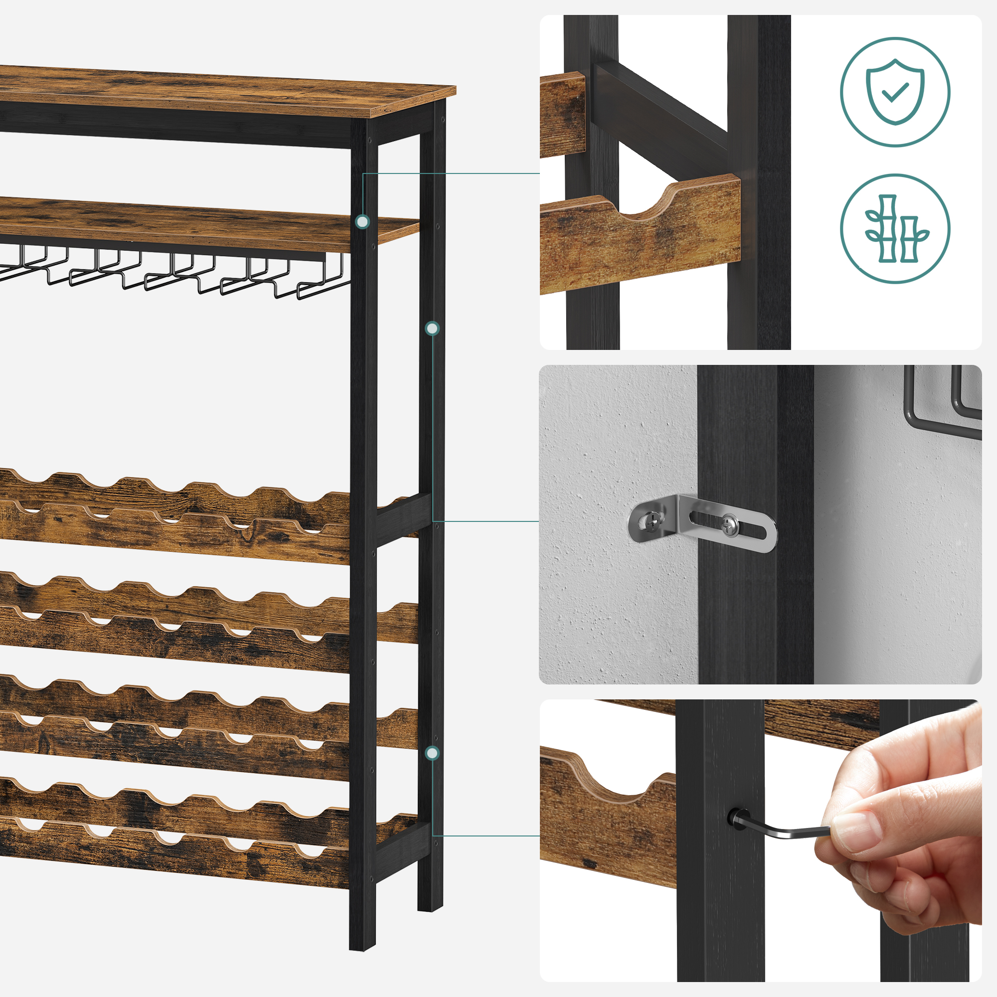 Showcase your wine collection in style with this elegant and functional wine rack. Designed to hold up to 24 bottles, it also features a tabletop for serving and a shelf for storing glasses or accessories—perfect for entertaining or everyday use. Crafted from durable bamboo and MDF, it combines long-lasting quality with a modern, rustic look that suits kitchens, dining areas, or even basements. Notches in the horizontal bars keep each bottle securely in place, while the included tilt protection adds extra stability. With clearly labeled parts and simple instructions, setup is quick and hassle-free, so you can focus on enjoying your next glass.