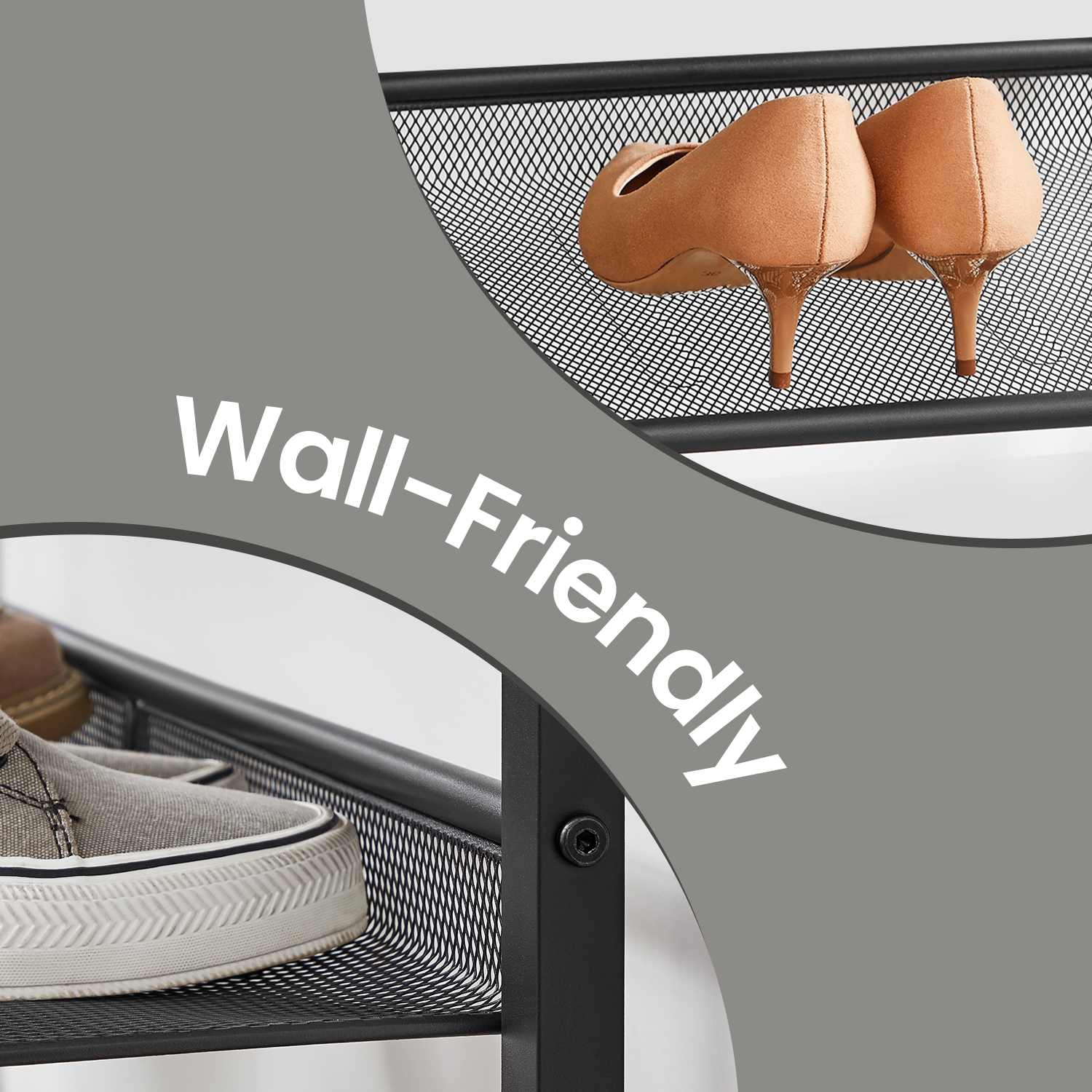Worry-Free Storage: Each shelf can be placed flat or angled by mounting it to different screw holes on the side frames, so you can store and display your shoes the way you like; the raised edge of the shelf prevents your shoes from getting your wall dirty.