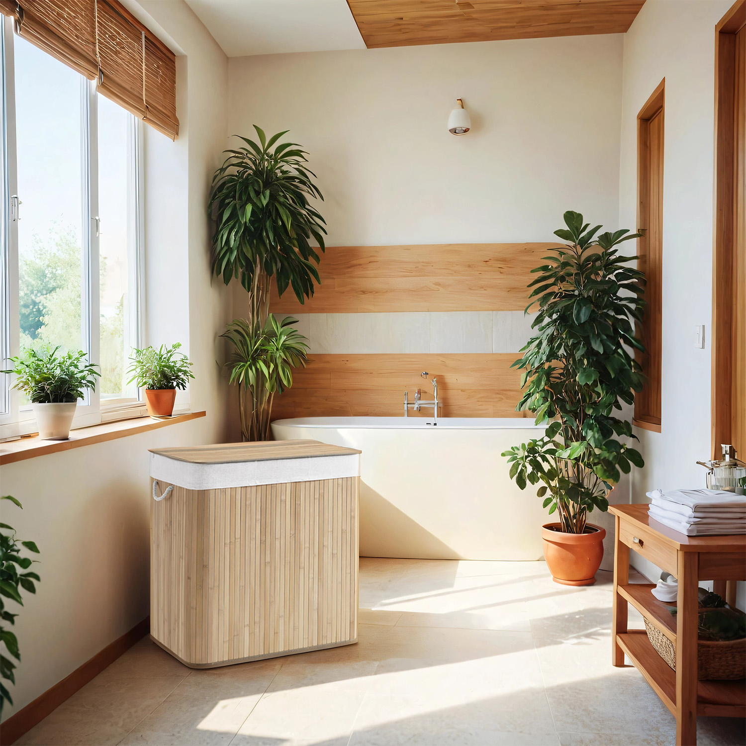This spacious laundry basket features a convenient one-hand lid that keeps laundry covered, controls odors, and protects from dust. With a large 150L capacity divided into three sections, it helps you easily sort clothes by color. Crafted from durable 17 mm wide bamboo slats, it supports up to 25 kg and folds flat for space-saving storage. The removable inner liner bag is made of washable cotton fabric, making laundry day easier. Simple to assemble with clear instructions and equipped with cotton handles on both sides, this laundry hamper combines practicality and style for effortless use.