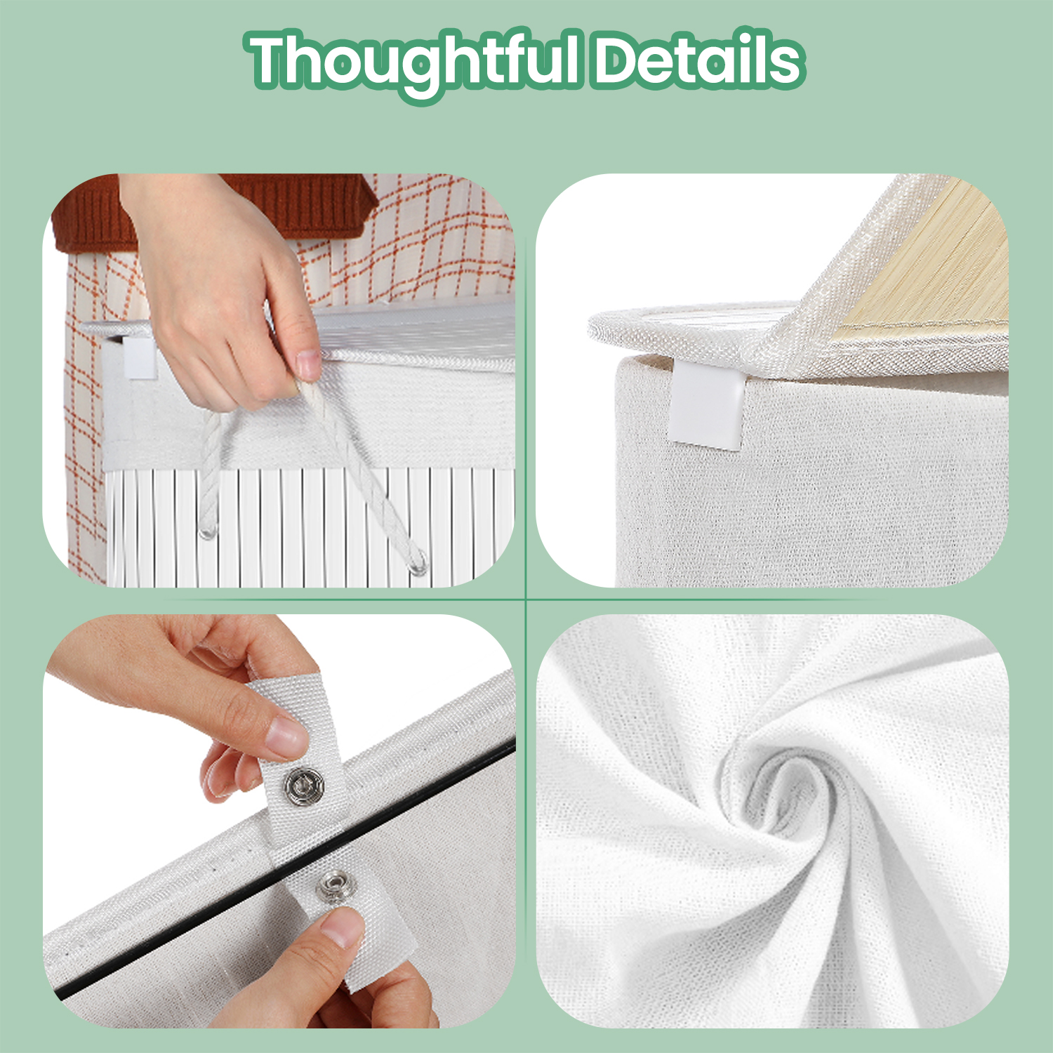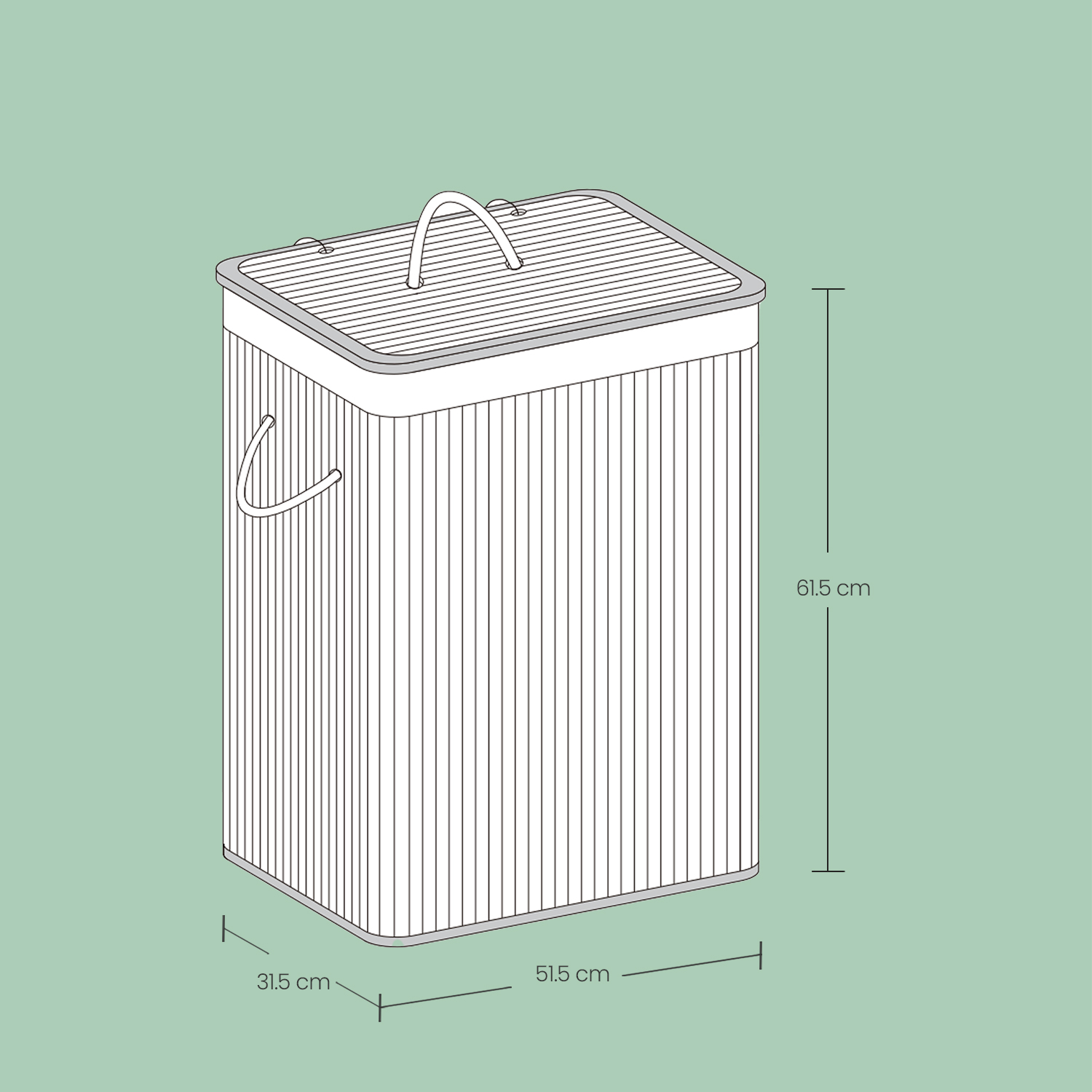 This bamboo laundry basket features a new clip-on lid for easy access and quick removal of the liner bag. Its reinforced base ensures excellent stability and strong load capacity, making it perfect for holding various clothing items. The breathable cotton liner is divided into two sections to help you separate light and dark laundry, preventing color transfer. Crafted from natural bamboo strips, this basket combines durability with a charming rustic look that adds warmth to any home. Practical and stylish, it’s an ideal solution for organizing your laundry while enhancing your living space.