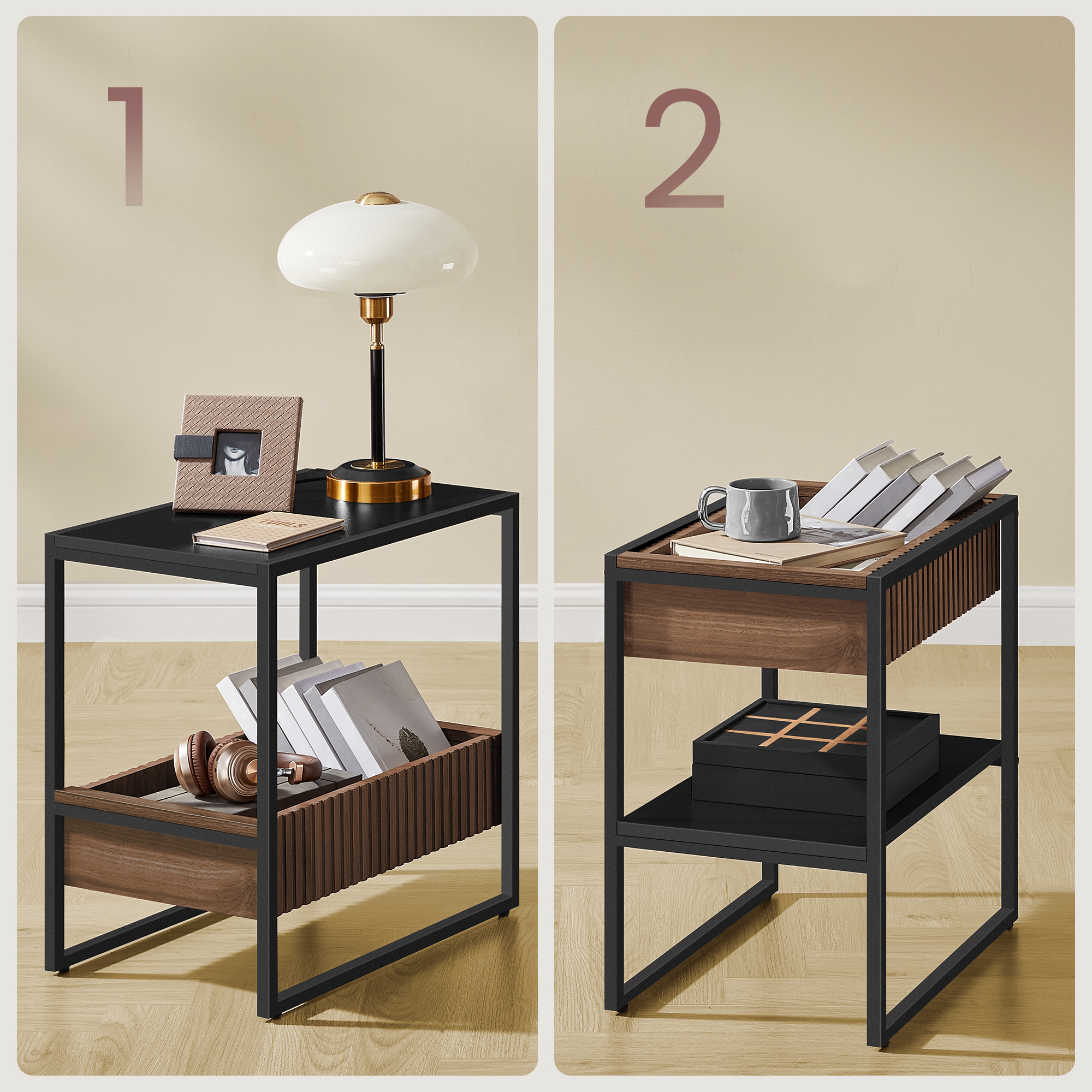 【For Small Spaces】 The upper and lower levels can be installed interchangeably. Standing at 13.8 “D x 21.7” W x 21.7 “H, this end table takes up little floor space. It can be placed by the bedside or next to the living room sofa. The tabletop is strong enough to hold up to 110 lb. The product can be rotated 360 degrees without affecting the aesthetics.