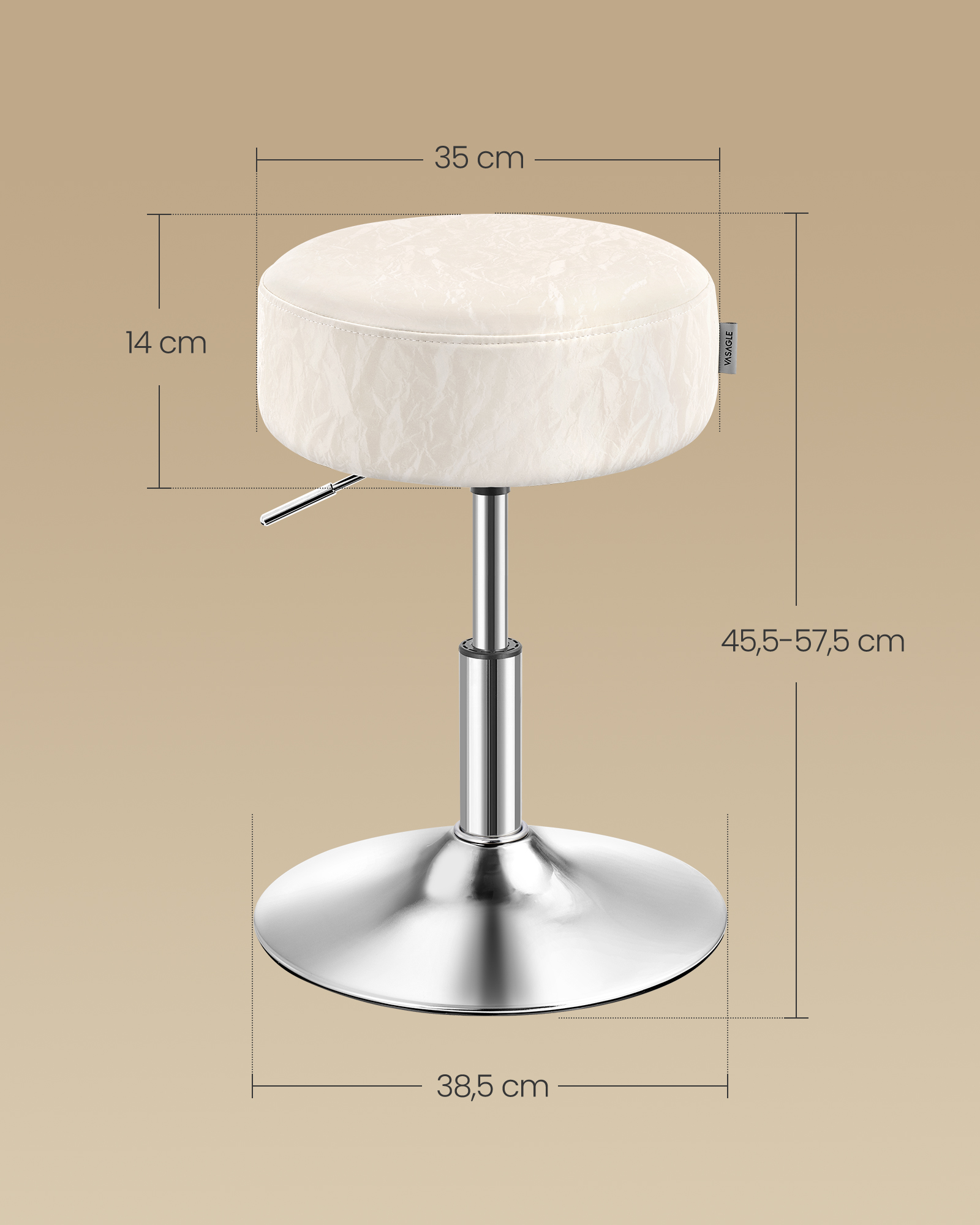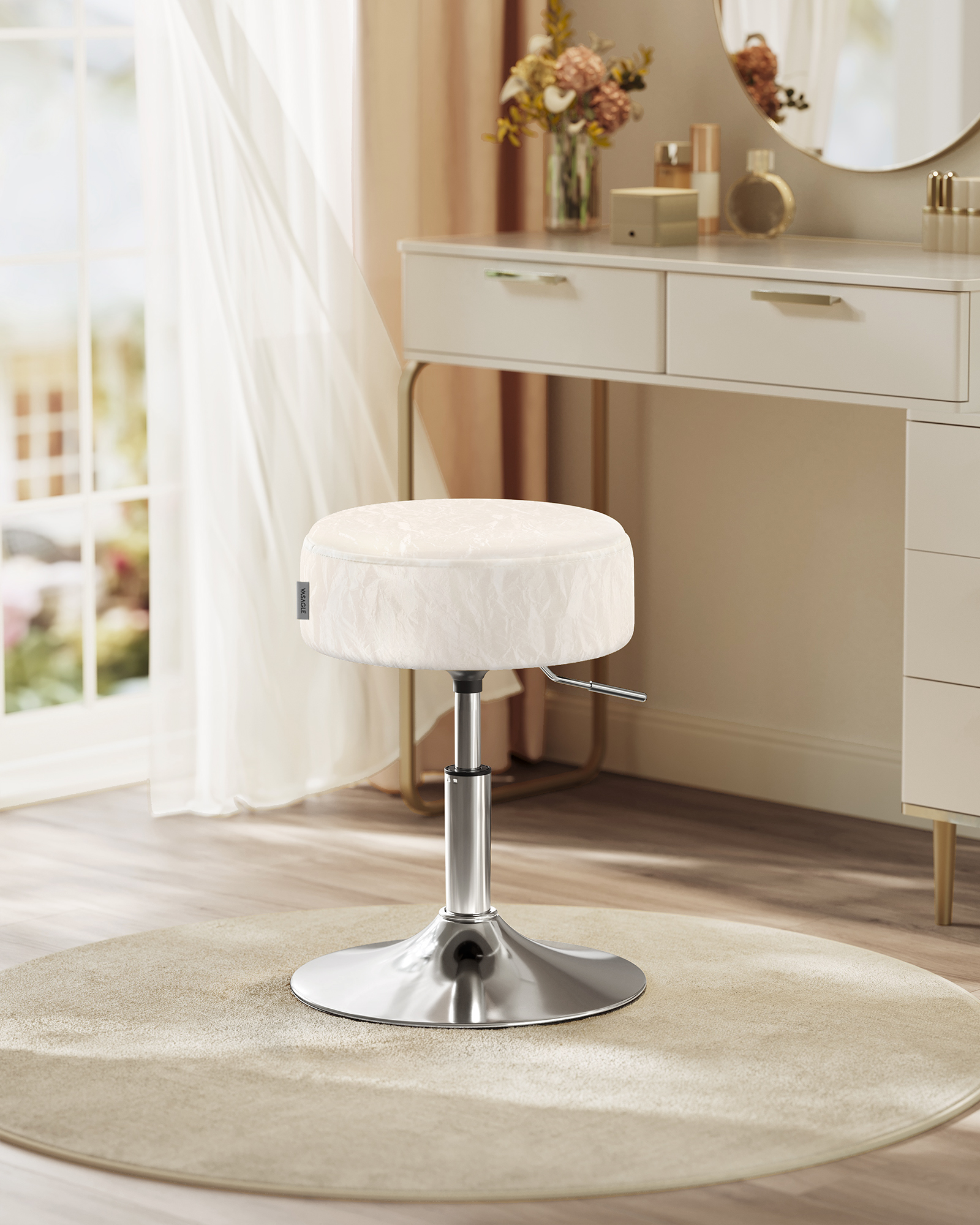 ADJUSTABLE AND STURDY: This vanity chair can be rotated 360° and can be adjusted from 44-60cm in height according to your needs. The round base with a diameter of 38 cm ensures high stability and safety when turning.