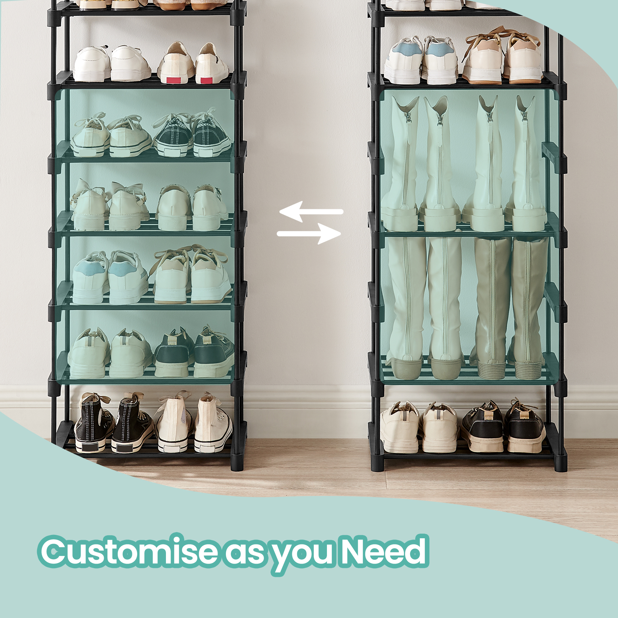 [Flexible Assembly] This shoe storage organiser can be assembled into different shapes. You can also split it into 2 small ones and use them separately in different rooms—it’s all based on your needs.