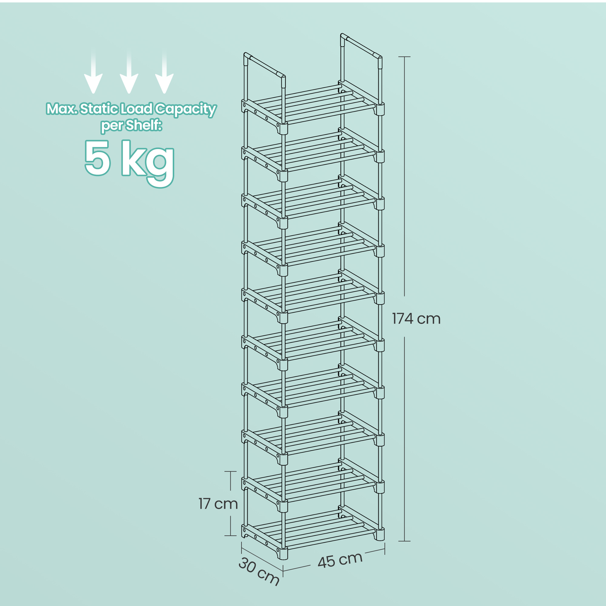 [Robust, Heavy-Duty, and Stable] Made of thickened metal tubes and quality plastic connectors, each tier of this tall shoe rack holds up to 5 kg, supported by 4 robust and durable metal tubes. The anti-tip kit enhances its stability.