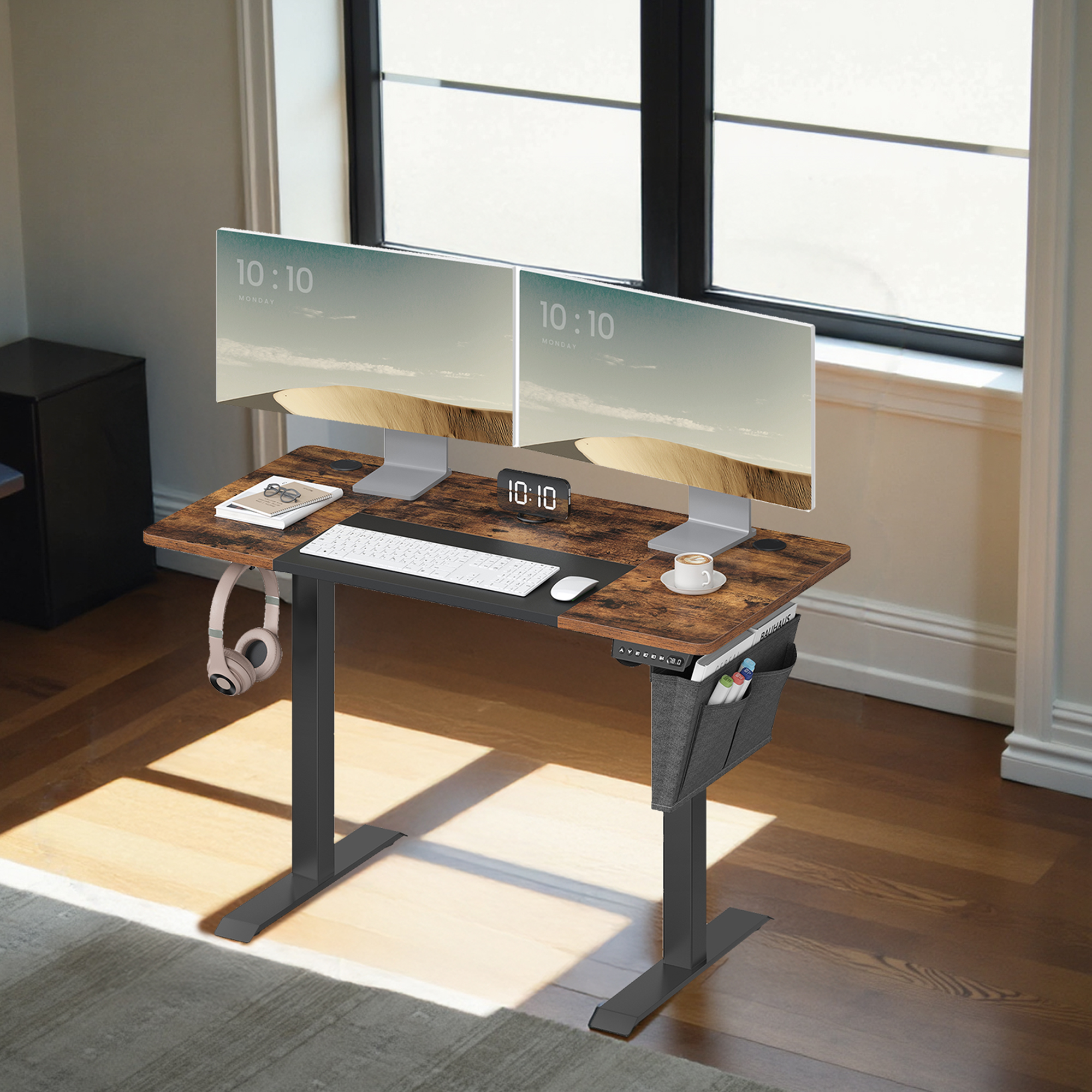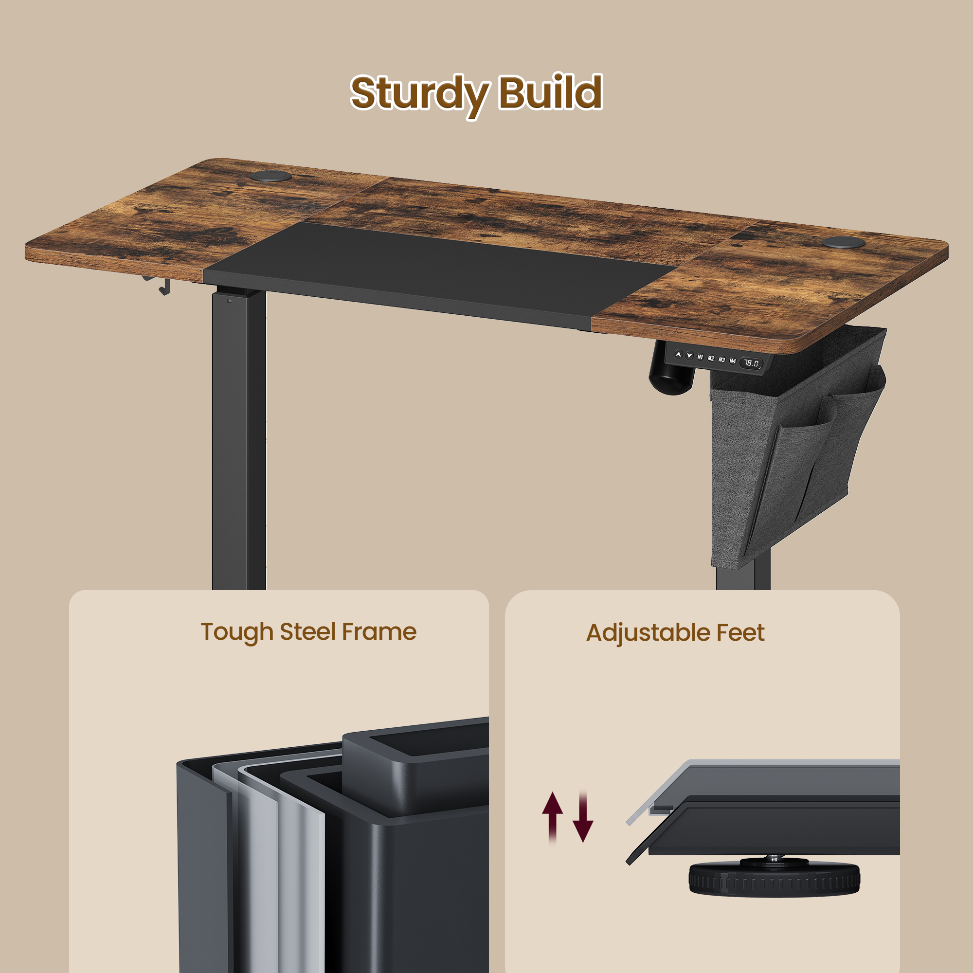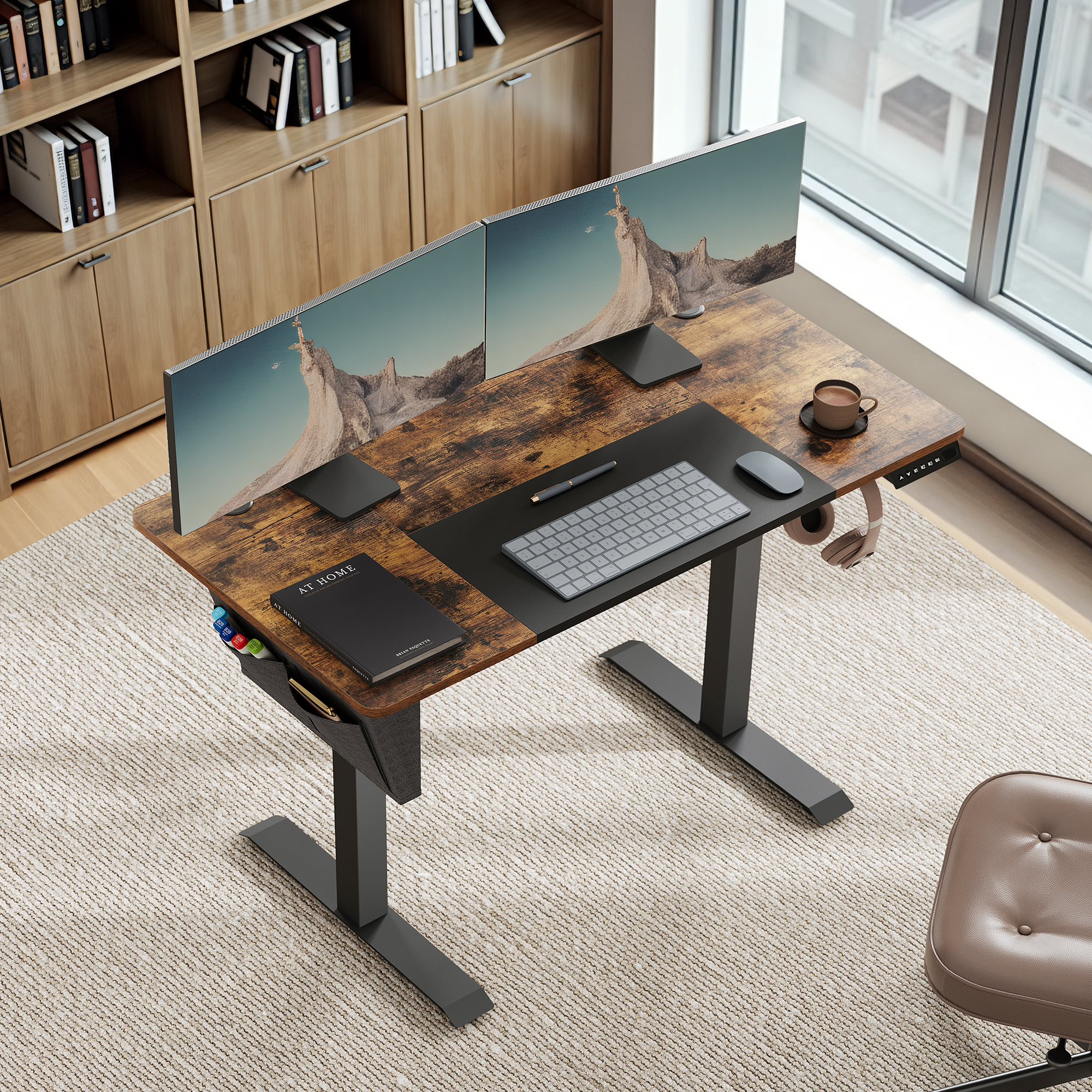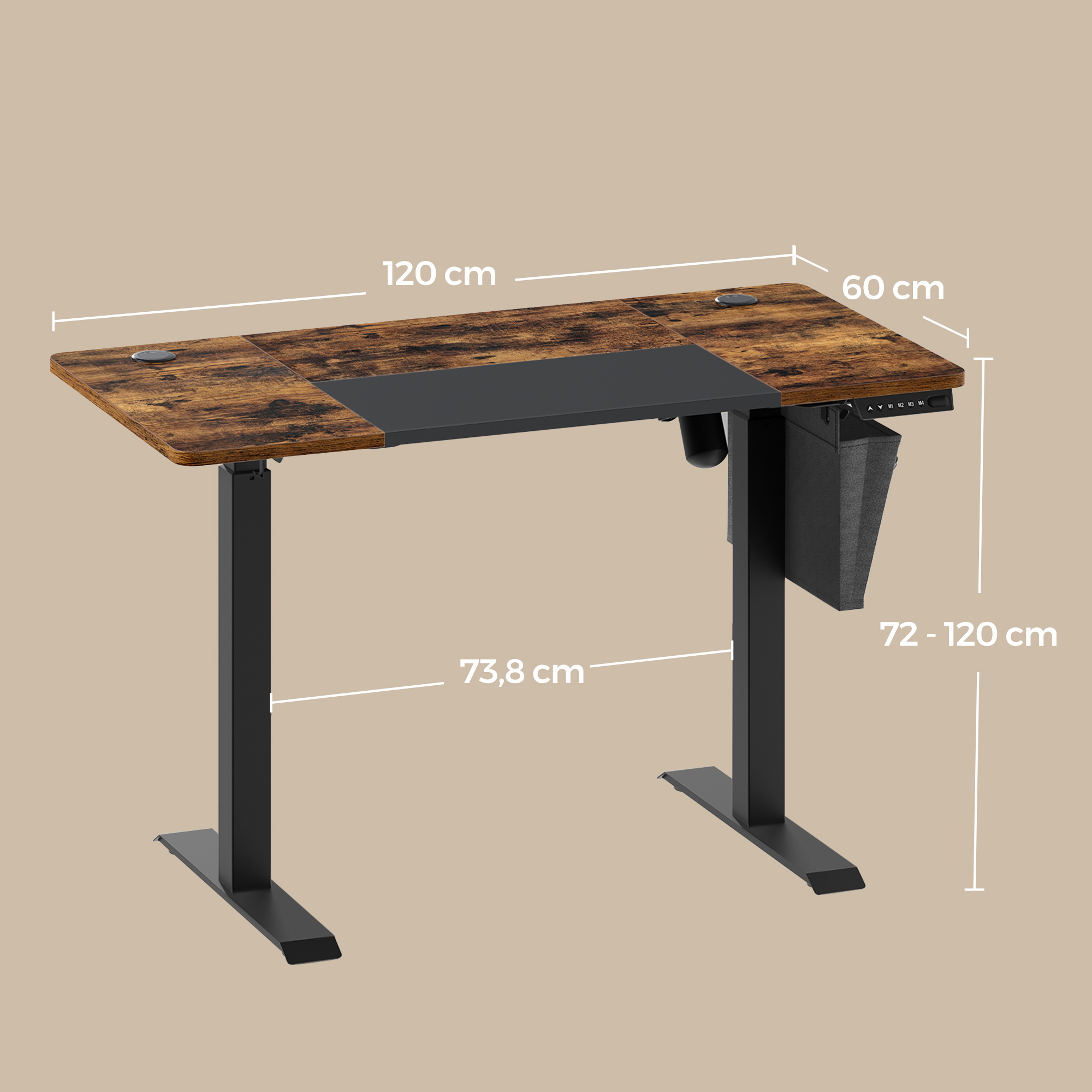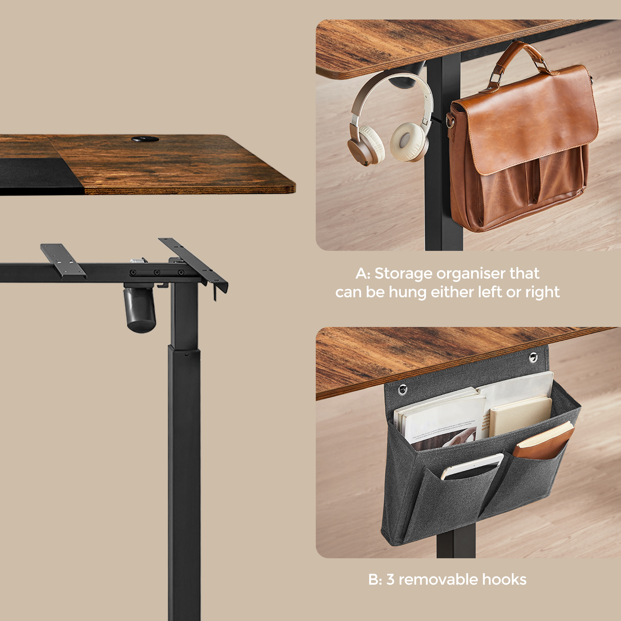 This electric desk offers adjustable height from 72 to 120 cm with 4 memory buttons for quick, personalized settings, plus built-in load protection for safety. Designed for organization, it features a fabric pocket on one side and two hooks on the other to keep books, stationery, and headphones within reach. Its stylish spliced tabletop combines vintage brown with textured black, adding a modern touch to your workspace. The sturdy steel frame supports up to 80 kg while operating quietly below 50 dB. Easy to assemble with labeled parts and clear instructions, this desk is perfect for creating a flexible and efficient work environment.