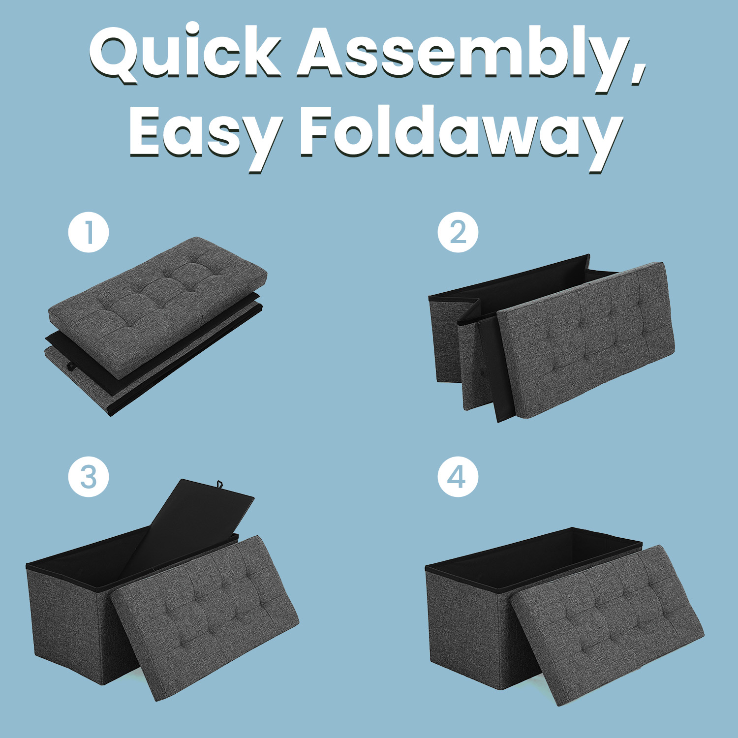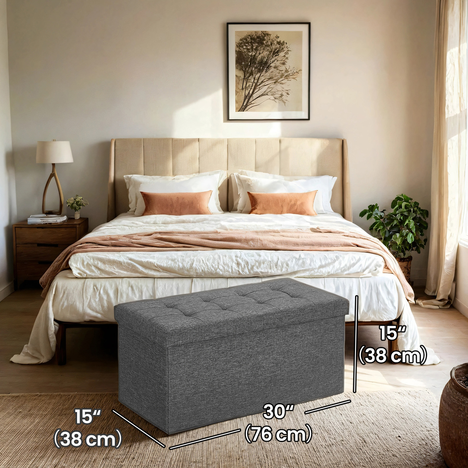 This foldable storage bench combines generous capacity with sleek functionality, making it a versatile addition to any room. Designed with a dual-opening lid, it allows easy access to contents without removing the entire top. With 80L of storage space, it neatly holds blankets, clothes, or magazines to keep your space clutter-free. The sturdy MDF structure supports up to 300 kg and comfortably seats two adults, certified by TÜV Rheinland for safety. Upholstered in dark grey linen, it adds a modern touch while offering lasting comfort. Quick to assemble and easy to fold, it’s ideal for entryways, bedrooms, or living rooms.