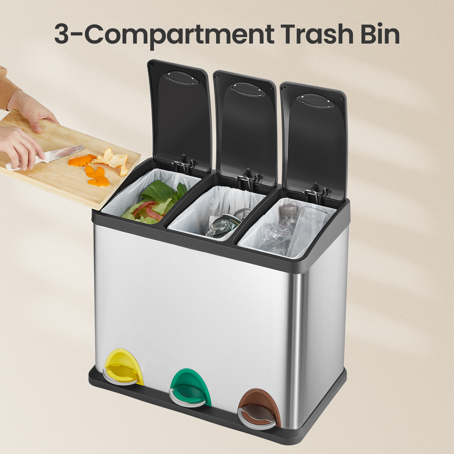 This stylish 3-in-1 step bin is the perfect solution for efficient waste sorting and recycling in your kitchen, office, or garage. Featuring a durable steel body and airtight lids, it keeps odors contained while providing long-lasting performance. The three color-coded pedals make recycling easy and fun, helping to quickly identify compartments and encouraging good habits for the whole family. Each section includes a removable inner bucket with handles, simplifying emptying and cleaning. Combining practicality with sleek design, this bin helps you maintain a tidy, organized space while supporting eco-friendly living.