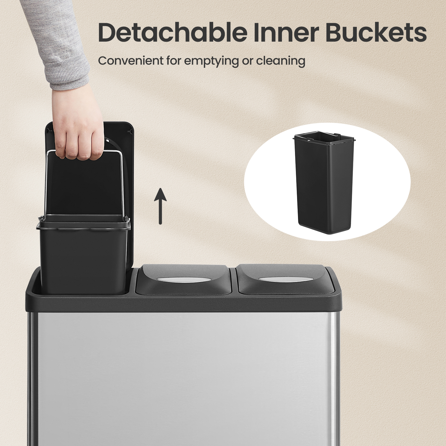 What You Get: A 24L rubbish bin with 3 sections, differently coloured pedals and removable inner buckets for easy waste disposal and hassle-free recycling.