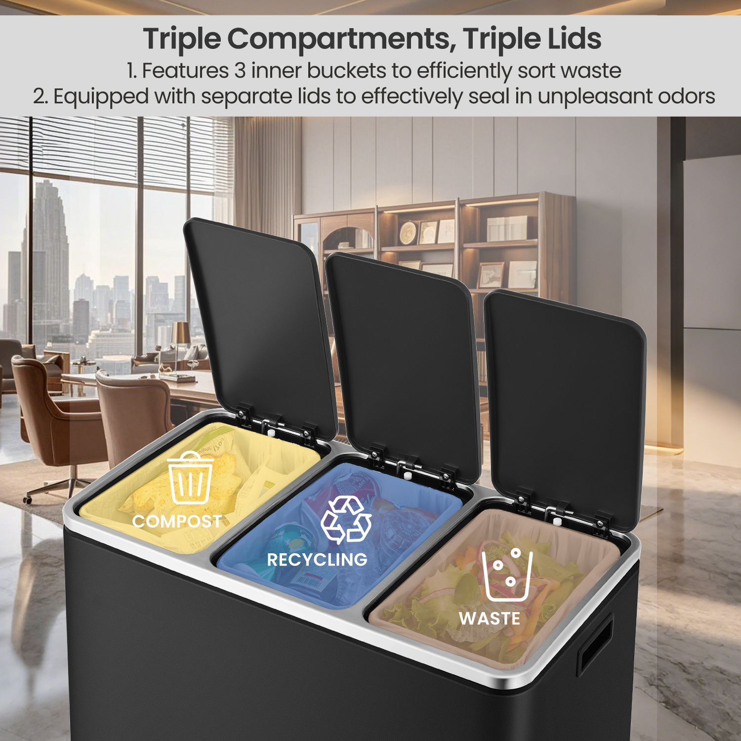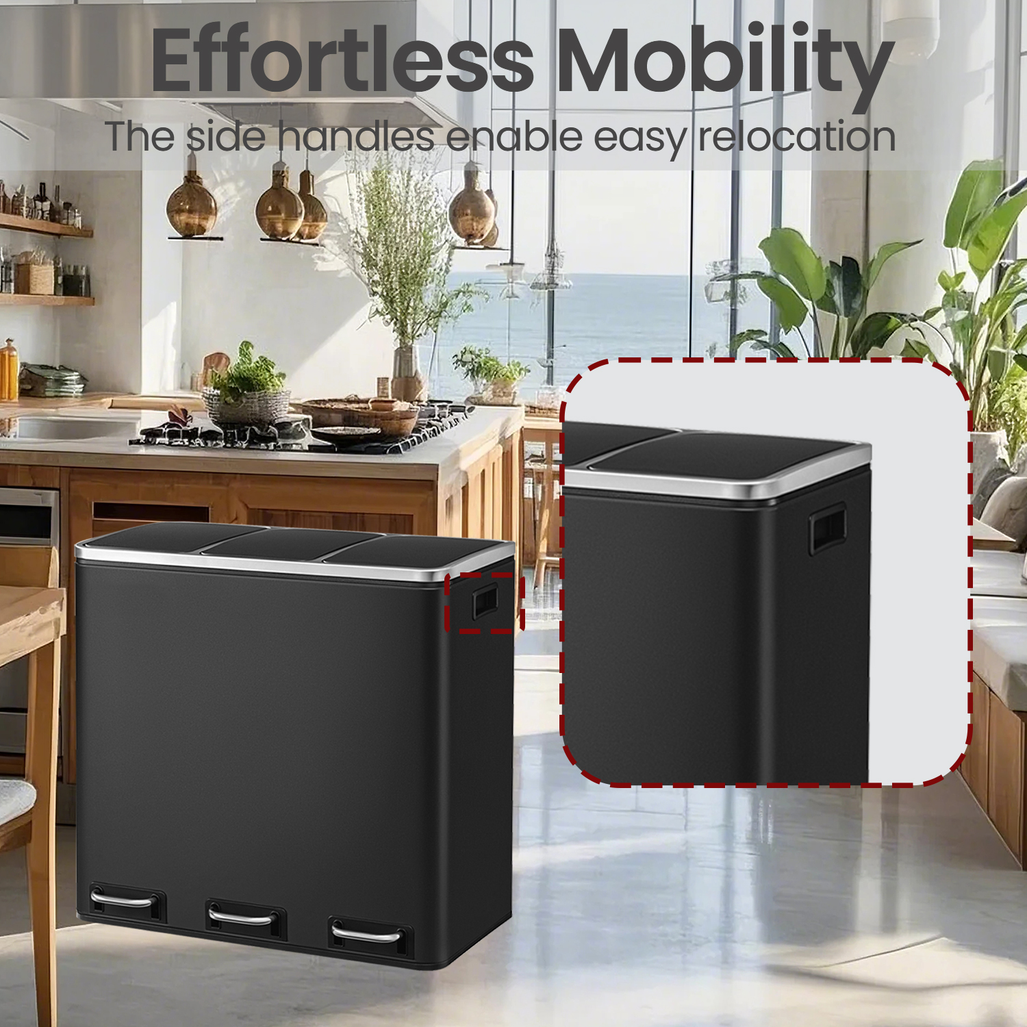 A Boon for Your Kitchen: Highlighting pleasing aesthetics and convenient function, this sleek pedal bin features 3 compartments to make separating your recycling a snap, and it can all be done without even touching the bin!