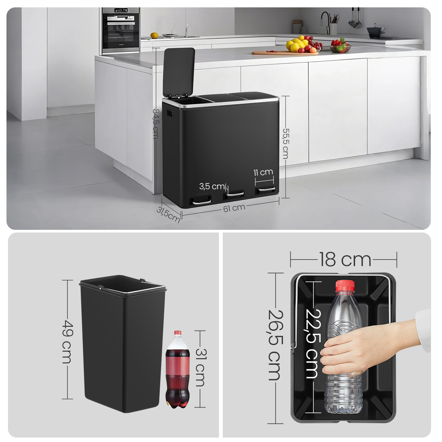 What You Get: A black rubbish bin with 3 x 18L compartments, convenient pedals, and removable inner buckets for easy waste disposal and hassle-free recycling.