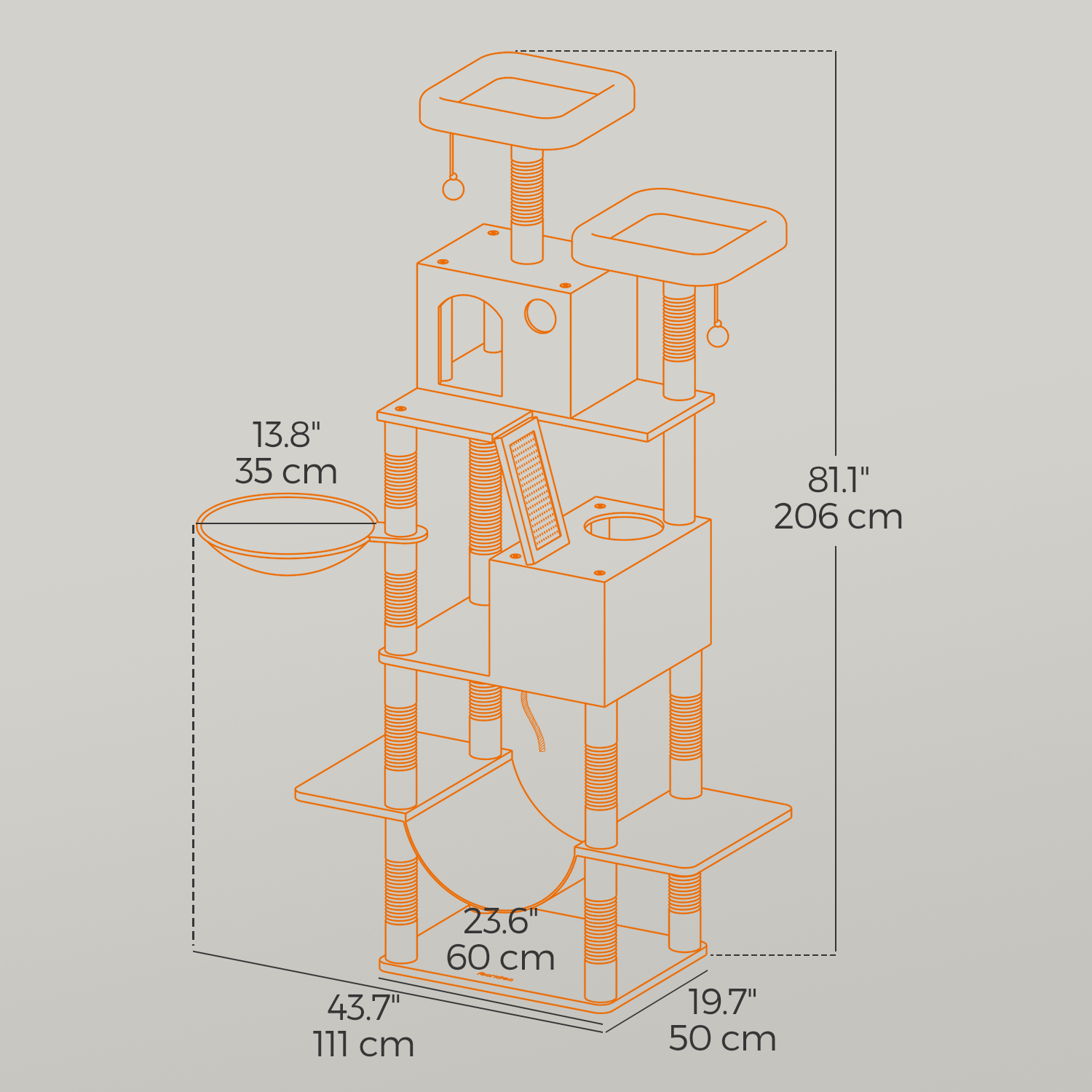 This towering 206 cm cat tree offers endless climbing fun with five levels spaced closely for easy access. Designed for multiple cats, it features two plush perches, cozy caves, a fluffy basket, a hammock with a play rope, and playful pompoms for endless entertainment. Made from quality particleboard with a reinforced base and anti-tip kit, it ensures safety and stability even for up to six cats. Equipped with 13 scratching posts and a ramp that doubles as a ladder, it protects your furniture while supporting cats of all ages. Plus, it includes an extra pompom, giving your playful pets even more fun options.