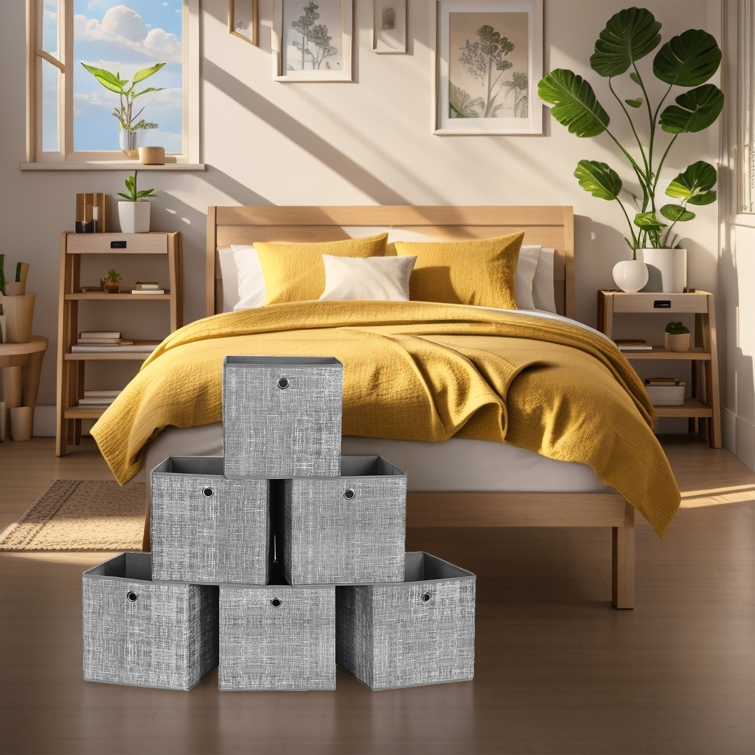 This set of six lightweight storage boxes is perfect for organizing toys, remotes, blankets, and other household items that often get misplaced. Made from sturdy 2mm cardboard covered with durable non-woven fabric, each box holds up to 5 kg and maintains its shape reliably. Their compact size fits seamlessly into most shelves, cube organizers, or wardrobes, while integrated grommet handles make them easy to pull out and carry. Designed for convenience, these boxes can be quickly assembled or folded flat for space-saving storage. A practical and stylish solution to keep your home neat and clutter-free.
