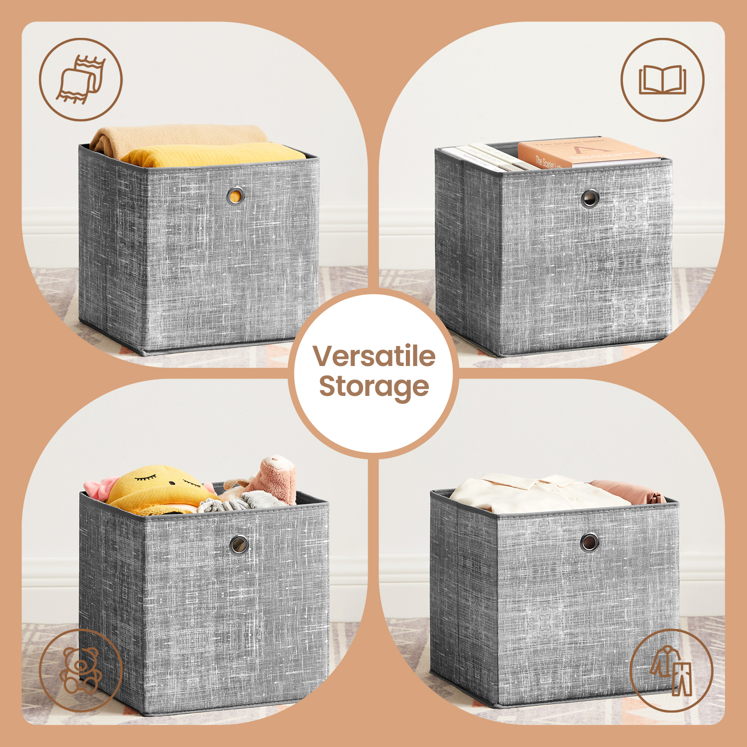 Suits Tight Spaces: The 30 x 30 x 30 cm size allows it to fit most storage shelves, cube storage units, or wardrobes; thanks to the integrated grommet handle, these boxes can be lifted or pulled out with ease.