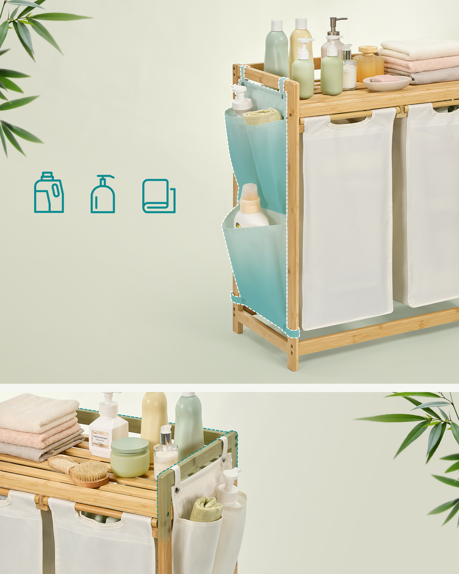 This natural bamboo laundry basket offers a practical two-compartment design, allowing you to easily sort clothes by type or color. It features sturdy shelves that provide ample space for detergents and laundry essentials, while small side pockets offer additional storage for smaller items. Crafted from high-quality bamboo, the basket is both durable and stable, with side guards to keep items secure. The removable, washable bag is supported by a plastic panel to prevent sagging and is easily detached with Velcro fasteners for convenient cleaning. Its natural bamboo frame adds a harmonious touch to any home décor.