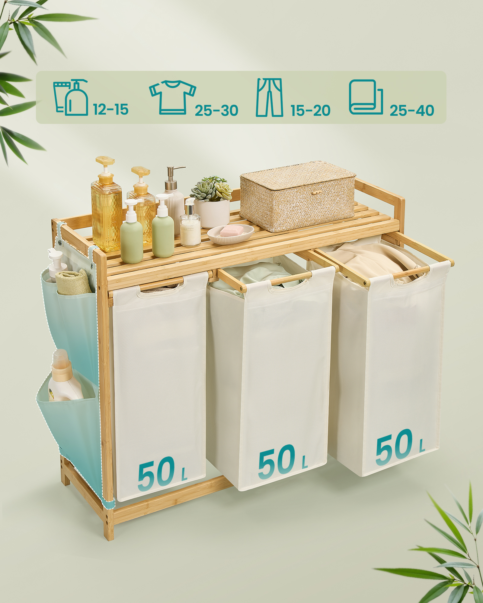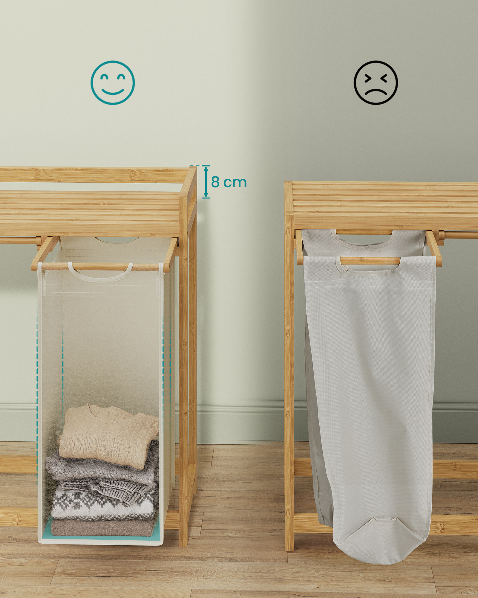 【ROBUST, STABLE AND LONG-LASTING】Constructed from premium bamboo, the laundry sorter is sturdy and durable, with the top shelf supporting up to 24 kg. The shelf features side protection to prevent items from falling off.
